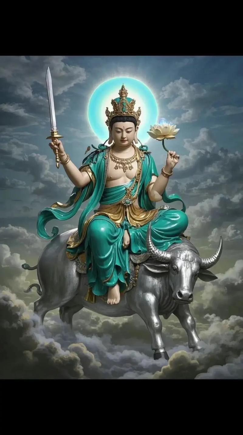 生肖牛的守护神并非随机指派,而是基于宇宙星宿运行与五行生克推演出的因缘、虚空藏菩萨主司智慧、功德与财富、在法相表现上,菩萨通常头戴五佛冠,右持宝剑,剑锋闪烁着智慧之光,意在斩断烦恼、破除执念;左手托起一颗璀璨夺目的如意宝珠,象征着能够满足众生一切良善的愿望。