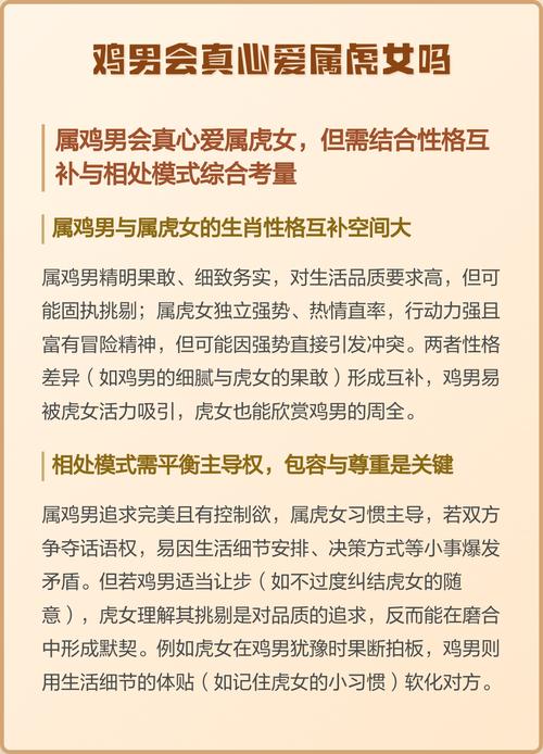 在现代社会,爱情往往被简化为“三观相合”、对于鸡虎组合来说,三观的统一并非天然存在,而是需要通过不断的磨合、碰撞甚至小范围的战争来重塑的、属虎的人要明白,属鸡的人挑剔你,是因为他在意你,想和你一起进步、属鸡的人要明白,属虎的人偶尔的专横,是由于他内心的责任感和保护欲。