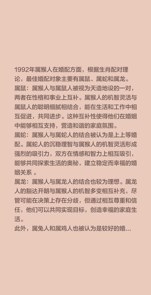 并非所有1992年出生的属猴男都有相同的性格、由于出生月份不同,其最佳婚姻年份也会有细微偏差。