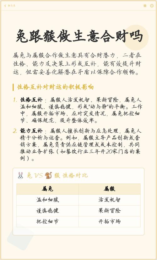 这种组合在创业初期极具爆发力、属猴人负责谈客户、跑融资、制造声势;属兔人负责合同细节、财务收支、客户维系、如果两人是合伙关系,财富的增长速度往往呈几何倍数攀升、但需要注意的是,属猴人容易在财富暴增时产生膨胀心态,产生越过属兔人进行私下决策的冲动;而属兔人一旦感到不安全,就会产生强烈的撤资或退缩心理、这种心理博弈,是损耗财运的最大隐患。