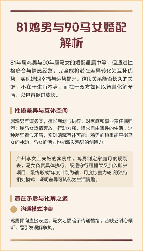针对1981年属鸡人与属马人婚姻在2026年的具体操作策略,可以为几个字:以缓克急,以土化火,以合应破、在做重大决定前,强迫自己等待三天,这是“以缓克急”、在家庭布置上多用米色、黄色、咖啡色系,这是“以土化火”、在发生争执时,主动寻找两人的共同目标或利益连接点,这是“以合应破”。