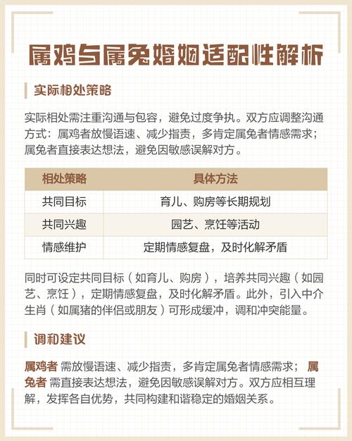 若为同事或合作伙伴,则可成就一番事业、这恰是一对绝佳的内外组合、属鸡人高瞻远瞩,善于规划与执行,适合冲锋陷阵,开拓市场、属兔人心思缜密,善于处理人际关系与内部细节,能够稳固后方,查漏补缺、只要分工明确,权责清晰,彼此尊重对方的专业领域,便能将金伐木的冲力,转化为推动事业前进的动力。