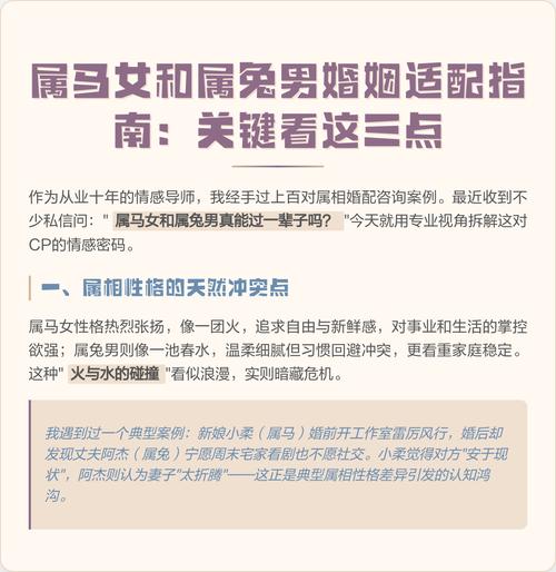 婚姻或长期伴侣关系的本质,不是寻找一个完全契合的人,而是寻找一个愿意为你不断调整频率的人、属兔男要学会欣赏马男那种英雄主义式的浪漫,那是你平淡生活里的光;属马男要学会珍惜兔男那种润物无声的守候,那是你倦鸟归林后的港湾。