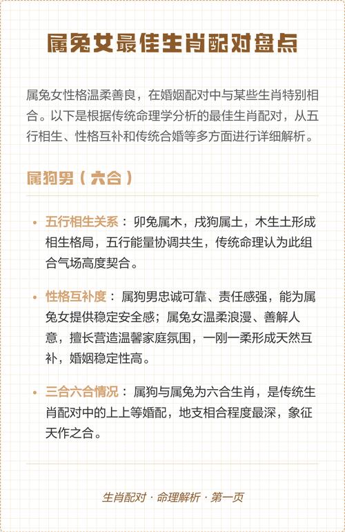 属兔女与属狗男的结合,堪称天造地设的绝配、在十二生肖的六合关系中,卯戌相合,意味着彼此之间有着天然的吸引力与深刻的默契、属狗的男子,性情忠诚敦厚,富有责任感,他们稳重踏实的臂膀,恰好能为内心敏感、缺乏安全感的属兔女子提供最坚实的依靠。