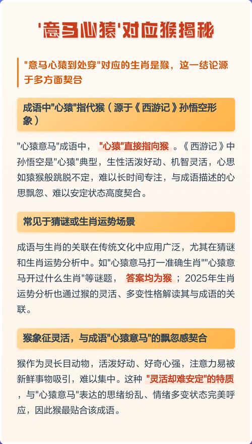 “意马心猿”这个成语,之所以同时指向马和猴,是因为它所描述的内心骚动,正是这两种生肖核心特质的结合体、马代表了身体上、行动上的躁动与不安于位,是对外部世界的不断探索与征服欲、猴则代表了精神上、思想上的躁动与念头纷飞,是对内在世界的无限好奇与变化追求。