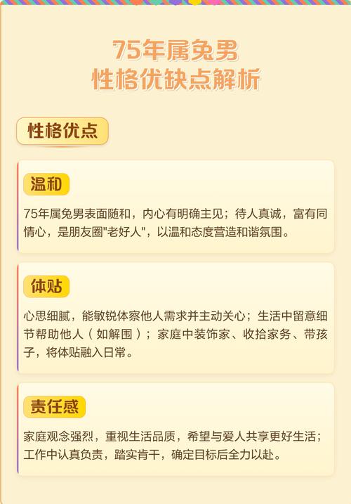 兔的警觉性体现在属兔男子的观察力上、他们拥有一双能够捕捉细节的眼睛和一颗敏感的心、你换了新发型,他会是第一个发现并给予赞美的人;团队会议上,他能敏锐地察觉到老板一个不易察觉的皱眉,从而调整自己的发言策略、这种细腻让他们在情感关系和职场协作中占据优势、他们懂得察言观色,能够体谅他人的难处,提出的建议也往往贴心周到,不会让人感到难堪、这种天赋让他们在需要共情能力和人际交往技巧的领域,如咨询、教育、设计等方面,能够大放异彩。