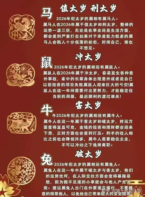 2026年丙午年,由于地支“午午自刑”,且午火力量过于炽烈,受影响的属相主要有四个:属马、属鼠、属兔、属牛。